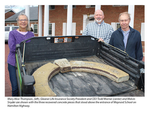 On April 21, 2025, Gleaner Life Insurance Society recovered and donated the three pieces that once sat above the door of the school. Their inscriptions read “Adrian Township School Dist. No. 8” with an “1875” keystone. Former Maynard School students Melvin Snyder and Mary Alice Thompson then donated the pieces this month to the Lenawee Historical Society Museum.