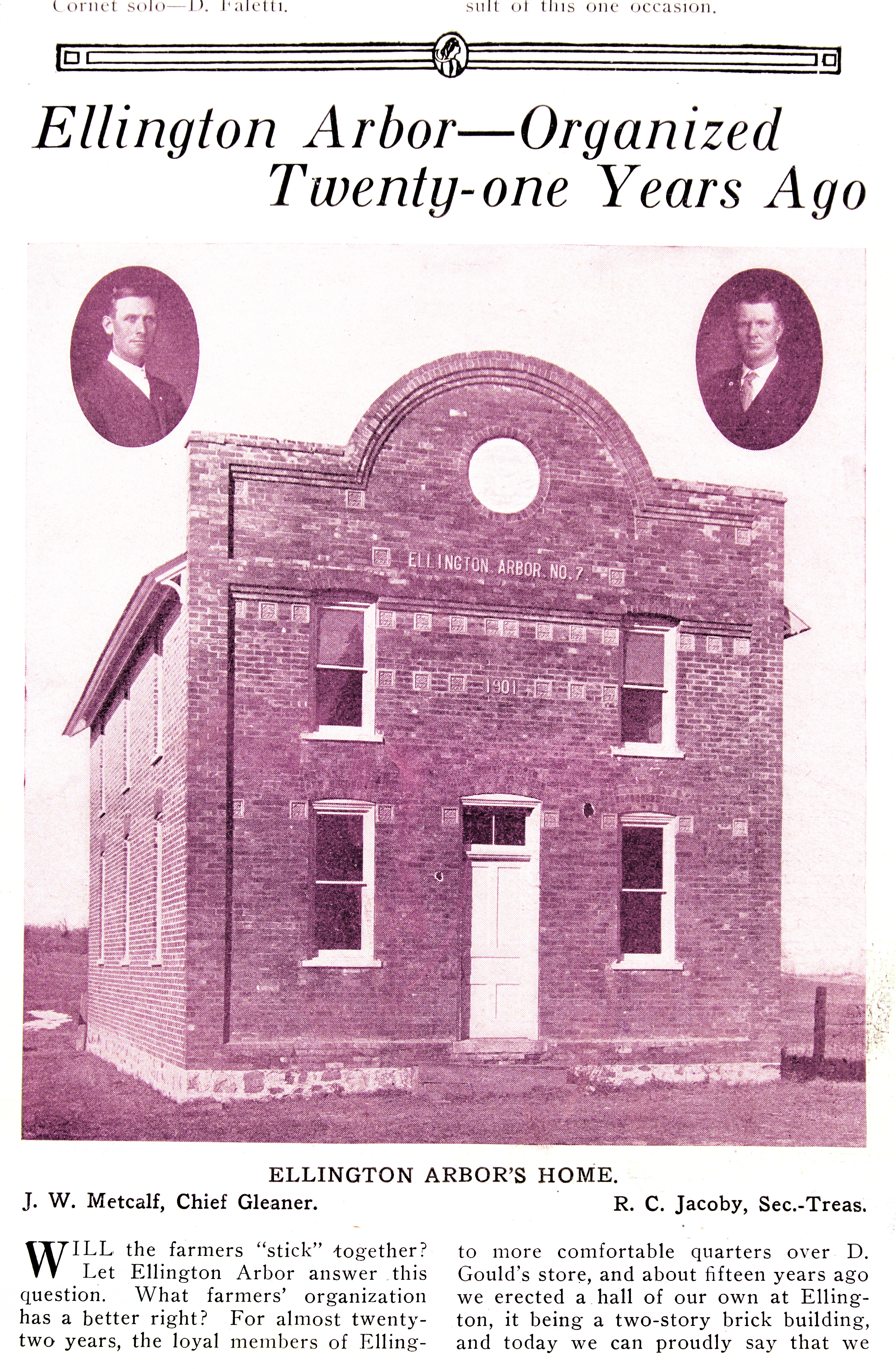 Just five miles northeast of Caro, where the Society began, Ellington Arbor (MI) played a key role in the Society’s early years. It was the seventh arbor created in the fall of 1894, and soon became the largest arbor with 40 members. It was the first group to hold the special initiation ceremonies used prior to the 1940s. The Society’s first death claim in 1895 was for Ellington member Ada Hutchinson. Fred and “Kitty” Orr were notable early members and a son, Herbert P. Orr, became the Society’s third President in 1936. Meetings were held in two other buildings before 1901 when this two-story brick hall was built. After reorganizing as Arbor #177, the arbor disbanded in 1940.